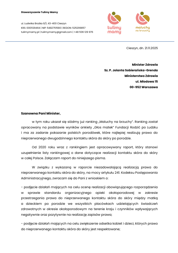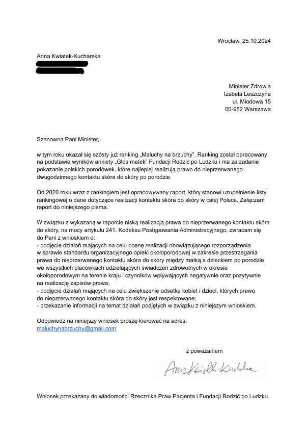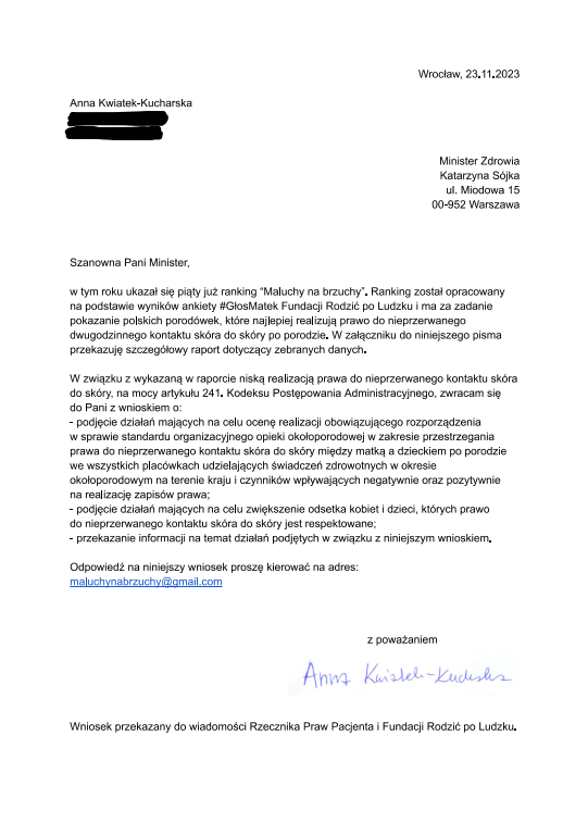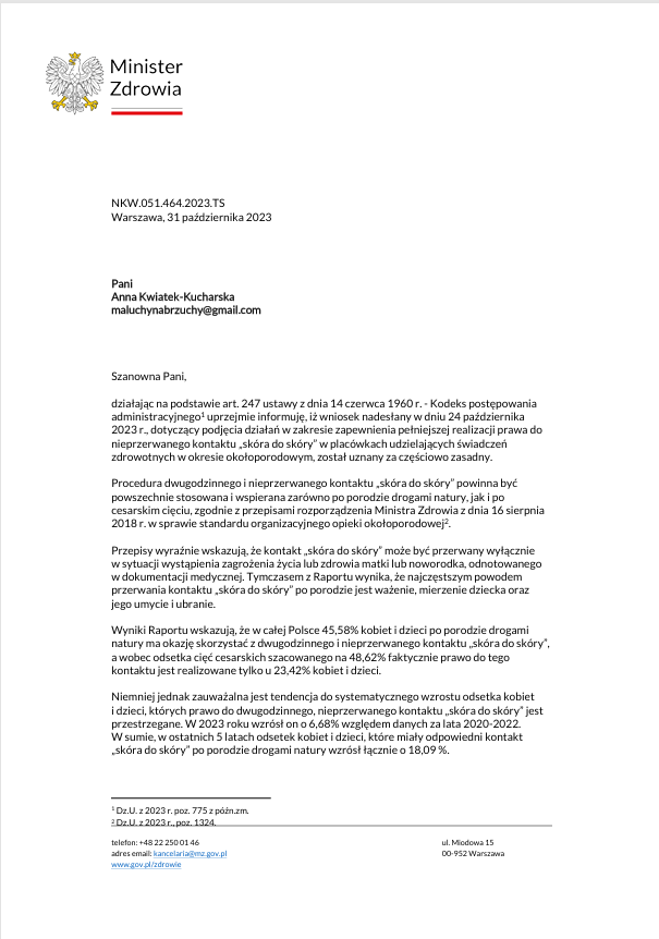 Raporty te są przesyłane do Ministerstwa Zdrowia wraz z wnioskami. Jesteśmy głęboko przekonane, że nasz głos jako obywatelek jest ważny i zwracanie uwagi decydentów na kwestię realizacji prawa do kontaktu skóra do skóry przybliża nas do realizacji celu naszej kampanii społecznej.
